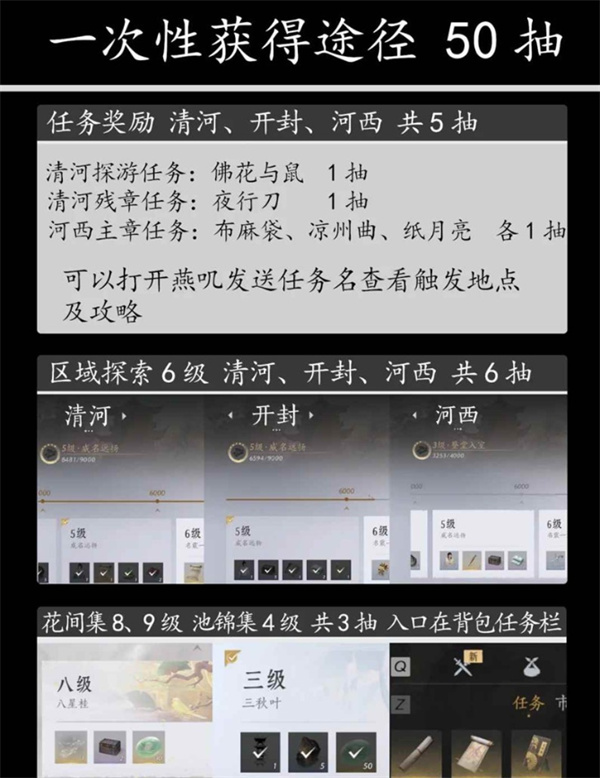 花间集等级达8级、9级;池锦集等级达4级:分别可获得1抽