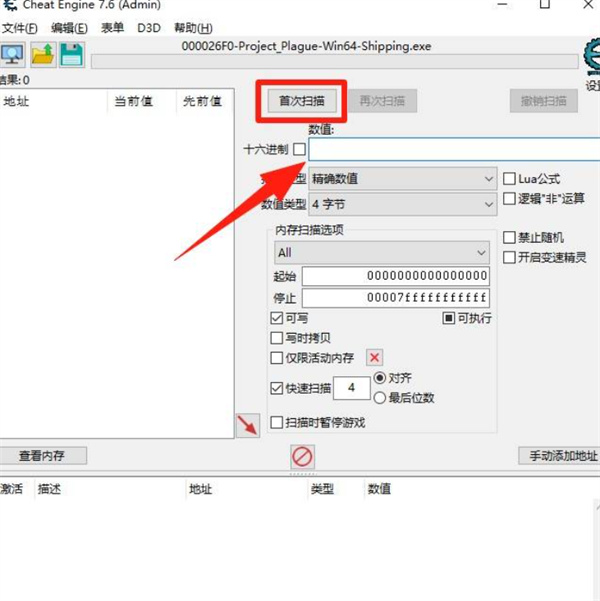 把你当前的金钱数填入右侧的“数值”栏,点击【首次扫描】。左边会出现大量地址。