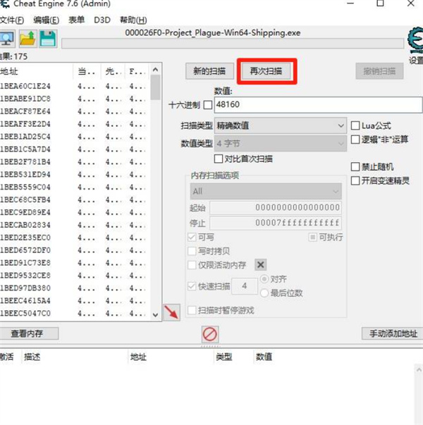 把变动后的金钱数值填写进CE,点击【再次扫描】。反复重复此操作,直到只剩几个地址。