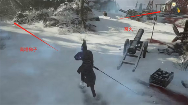 目标:点燃三座“血烟篝火”,即可自动放下吊桥。