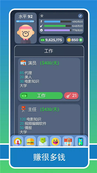 4、玩家需要靠工作赚钱来维持生活,虽然花钱快,但赚钱速度也很快,能保证生存。