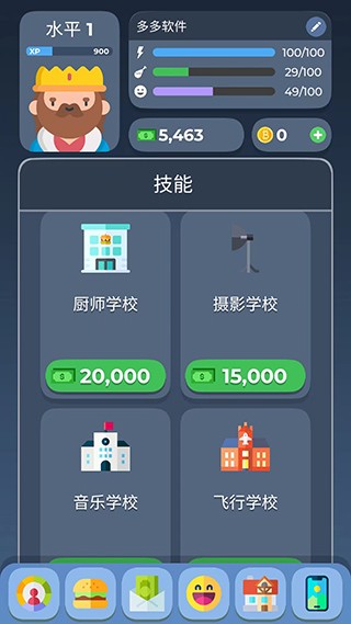 6、除了工作,还能学习技能,有技能后赚钱效率更高,不过学习会消耗体力、心情和饥饿值,要在状态较好时学习。