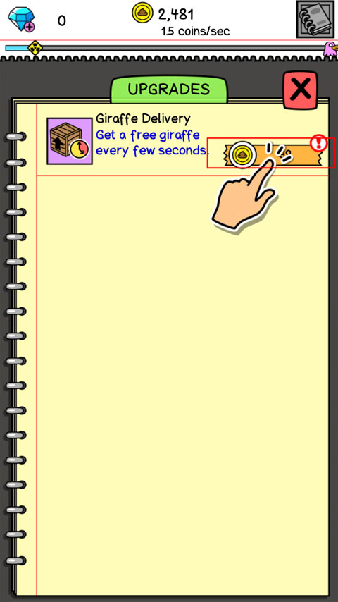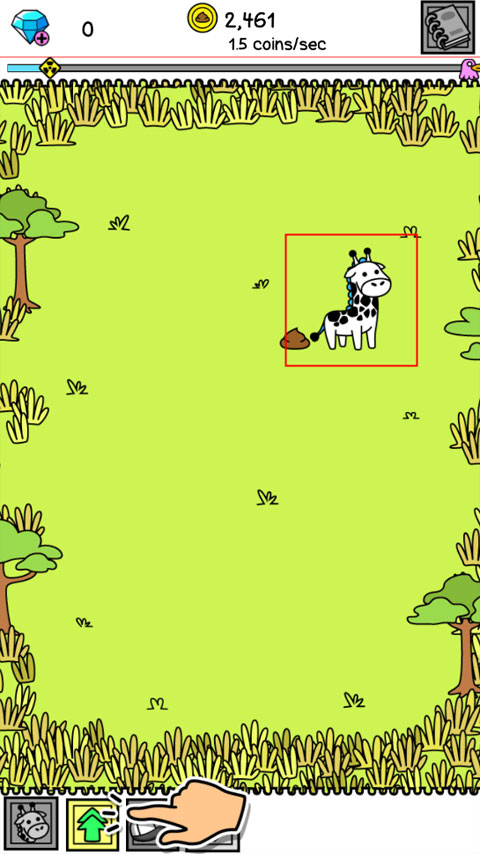 4、然后点击下方的双层树的图标购买箱子到屏幕上,箱子里面会有新的长颈鹿出现,并且多次点击长颈鹿可以快速拉出粪便,并获得更多金币。