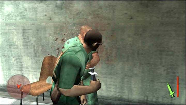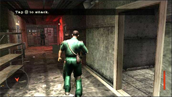 4、近身战斗:继续前行遇到壮汉,只能用拳击击倒。附近的房间有针筒和血瓶可补给。