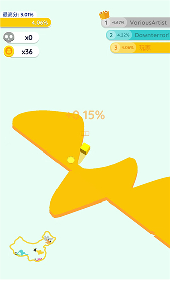 3、用手指移动方块,将滑动的方块沿着地盘围成一个圈,等这个圈闭合以后,就会变成你和你地盘一样的颜色,可看到【+0.46%】的提示,这样你的地盘就变大了。