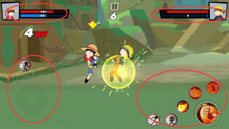 2、对战界面上方会显示双方的生命值和能量槽,左下角负责移动和回复能量,右下角是各种技能按键。