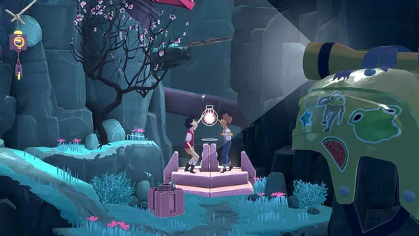 2、利用点亮的提灯唤醒横跨的桥梁,推进旅程,见【灯座】再度跃出。让T前行拉动风铃,关闭水桶中黑莲花,再指令A安置提灯于【灯座】,此【灯座】点亮黄莲花至停止。A再取回发光提灯至终点点亮。