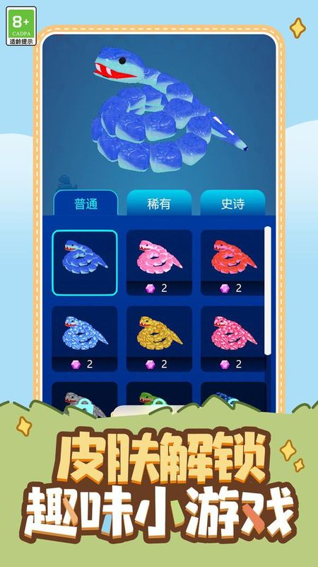 1、玩家可选用多种蛇形形貌,形态切换迅速,为你的游戏之旅添加个人风采。