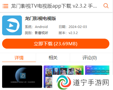 龙门影视3.0.3版本是一款功能强大的在线影视播放工具,专为用户打造全方位的观影体验。它汇聚了海量热门影视剧集资源,包括经典电影、热播剧集以及精彩综艺节目等,所有内容均可免费观看。作为纪念版的最后一个版本,龙门影视TV不仅提供无广告的纯净观影环境,还免去了会员费用,让用户随时随地享受高品质的娱乐时光。
