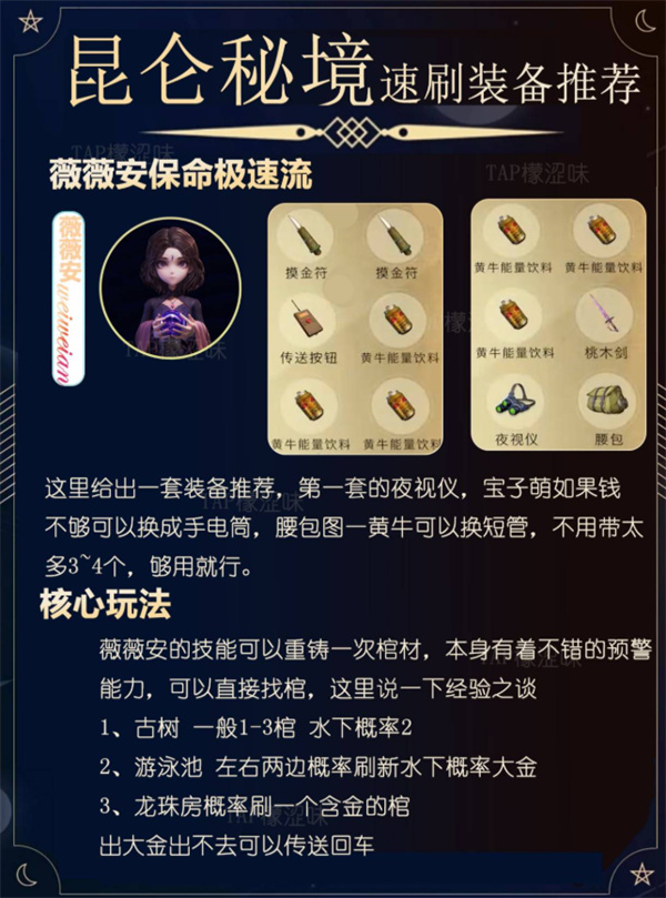 薇薇安技能可以重铸一次棺材,配合她优秀的预警能力,可以精准找棺速刷: